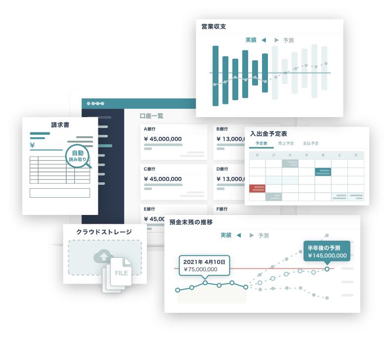 複数の銀行口座の残高・入出金をまとめて管理することができます。また、売上の入金予定や支払予定など資金繰り把握や経理業務のデジタル化の実現、インボイス制度や電子帳簿保存法にも対応できます。